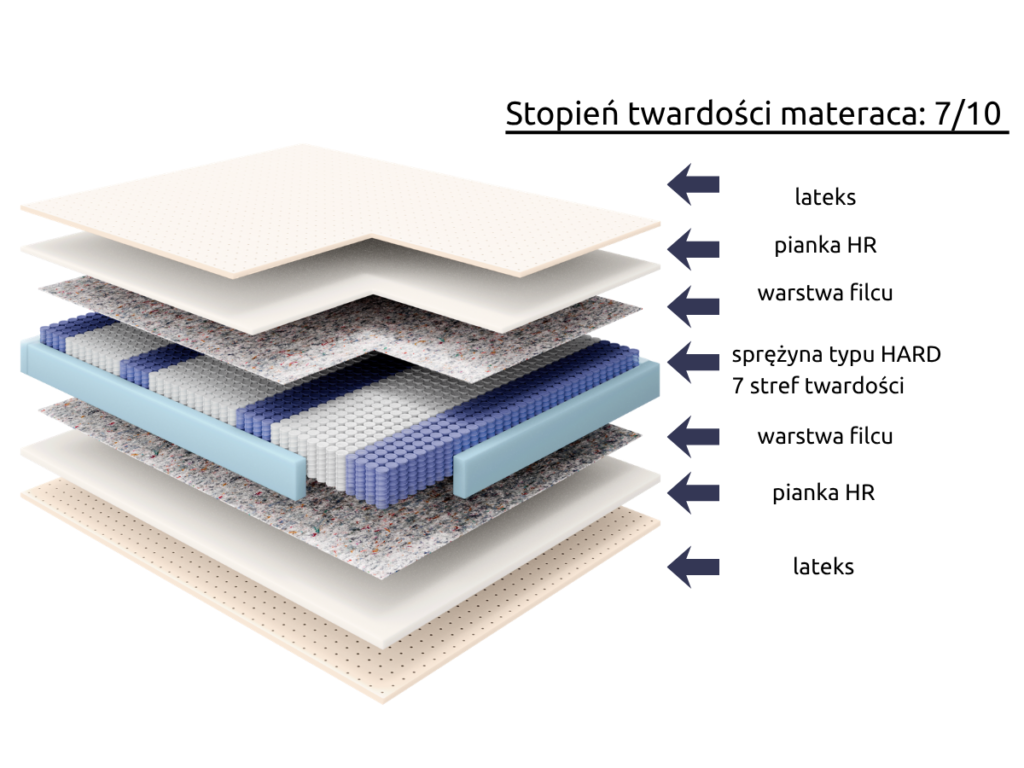 Sercem materaca jest utwardzony, 7-strefowy wkład sprężynowy HARD, który gwarantuje solidne wsparcie kręgosłupa i równomierne rozłożenie ciężaru ciała. Dzięki temu Cora zapewnia stabilny i zdrowy sen, także przy większym obciążeniu.