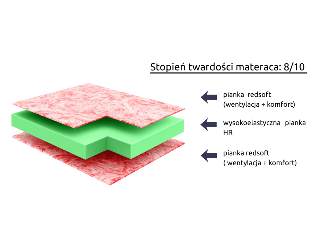 Metis to materac, który zapewnia twarde i solidne podparcie. Wykonany z wysokoelastycznej pianki HR o dużej gęstości, zapewniający mocne podparcie i odporność na odkształcenia nawet przy większym obciążeniu. Dla lepszego komfortu i wentylacji zastosowano warstwę pianki Red Soft, która subtelnie równoważy twardość rdzenia i wspiera cyrkulację powietrza w materacu. Materac posiada 7 stref twardości.